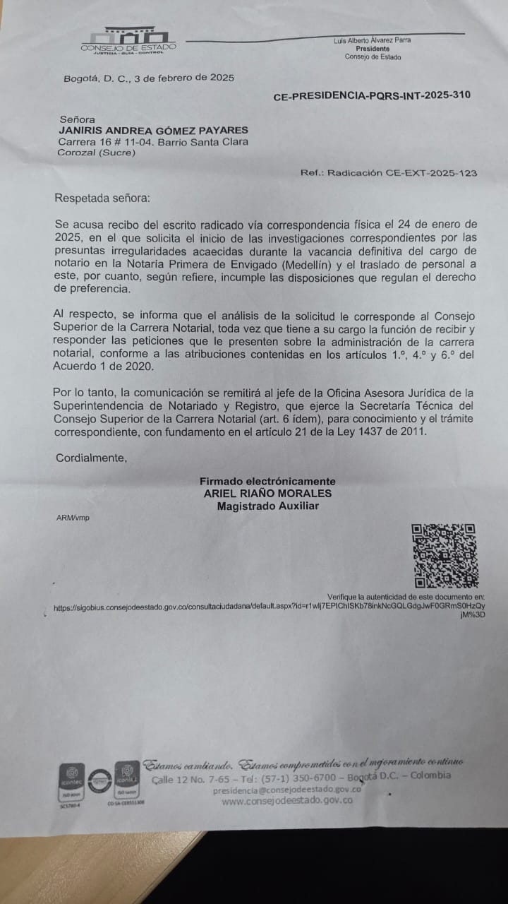 20/01/2025 | HÉCTOR DE JESÚS LESCANO GAVIRIA | Respuesta PQRS-Radicación CE-EXT-2024-3437 | PRESIDENCIA | Ver Documento |